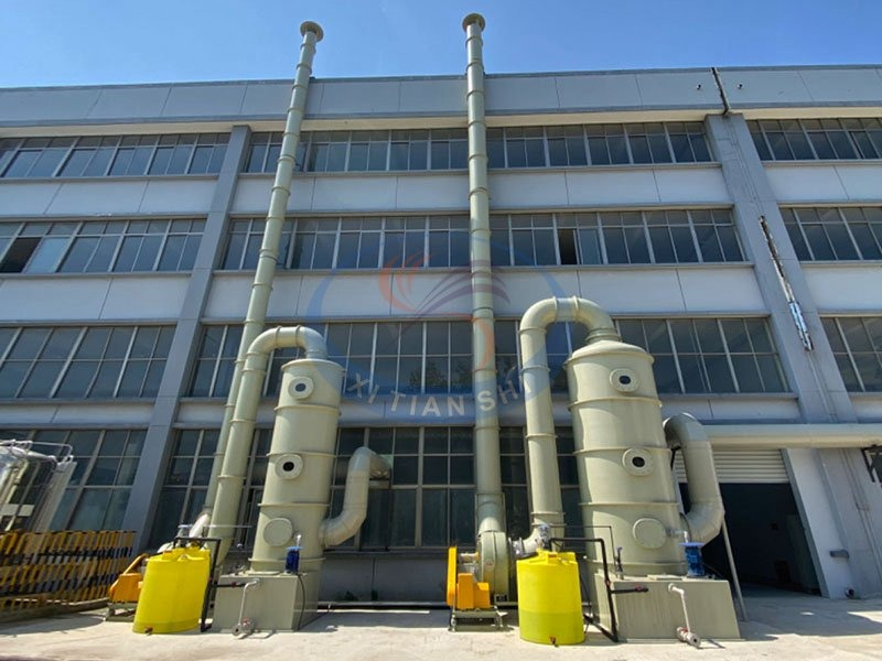 The system features a packed tower design for maximum gas-liquid contact efficiency, and is widely used in chemical plants, electroplating workshops, semiconductor manufacturing, and laboratory exhaust systems.